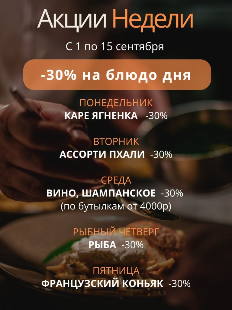 с 1 по 15 сентября в Гудаури действует скидка на блюдо и напиток дня.